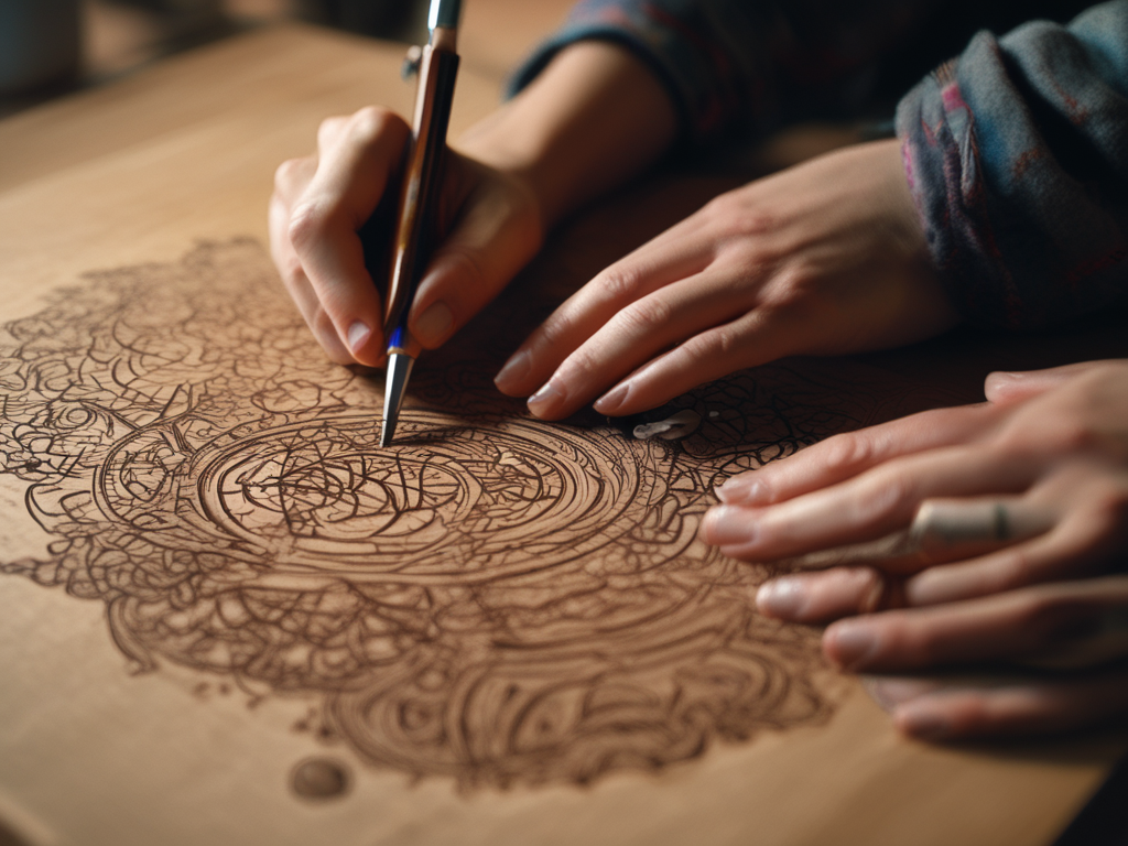 Bij pyrografie is het belangrijk om de juiste materialen te gebruiken. Naast het kiezen van het geschikte hout, zijn ook de pyrografiepen en -punten van cruciaal belang. Er zijn verschillende technieken die je kunt toepassen, zoals schaduwen, lijnen, stippen en textuur, waardoor je een breed scala aan artistieke mogelijkheden hebt. Belangrijk om te weten is dat het nooit echt helemaal diepzwart wordt, want dan zit men in de fase dat het hout verbrand.